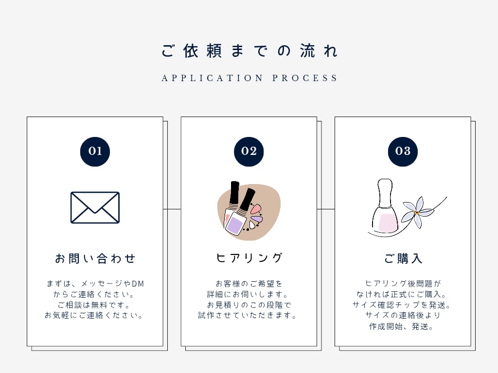 当方で制作したネイルチップのデザインの著作権は当方に帰属します。お客様からのオーダーで制作したネイルチップを、当方のSNSやサービス紹介のサンプルとして掲載させていただく場合がございます。掲載不可の場合はお申し付け下さい。
